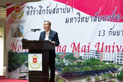 ดร.ณรงค์ ชวสินธุ์ อธิการบดี มหาวิทยาลัยนอร์ท-เชียงใหม่ มอบช่อดอกไม้แสด...