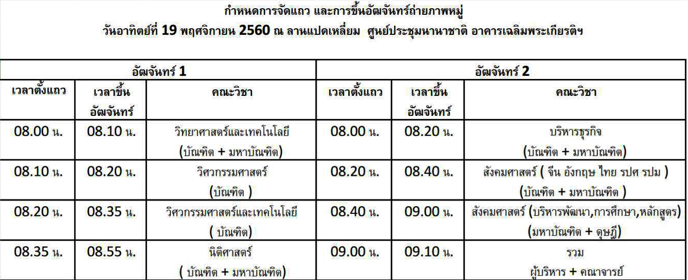 กำหนดการจัดแถว และขึ้นอัฒจันทร์ถ่ายรูปหมู่ พิธีประสาทปริญญาบัตร ครั้งที่ 15 วันอาทิตย์ที่ 19 พฤศจิกายน 2560 ณ บริเวณลานแปดเหลี่ยมศูนย์ประชุมนานาชาติ อาคารเฉลิมพระเกียรติฯ