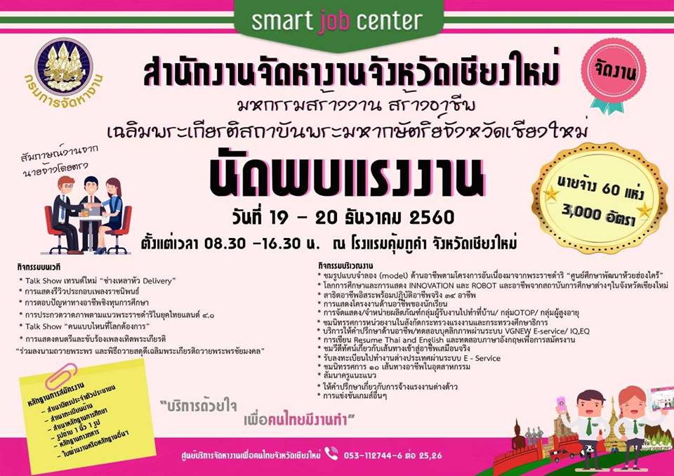 ข่าวประชาสัมพันธ์งานนัดพบแรงงาน ในงาน "มหกรรมสร้างงาน สร้างอาชีพ เฉลิมพระเกียรติสถาบันพระมหากษัตริย์จังหวัดเชียงใหม่" ในวันที่ 19 - 20 ธันวาคม 2560 ตั้งแต่เวลา 08.30 - 16.30 น. ณ โรงแรมคุ้มภูคำ จังหวัดเชียงใหม่