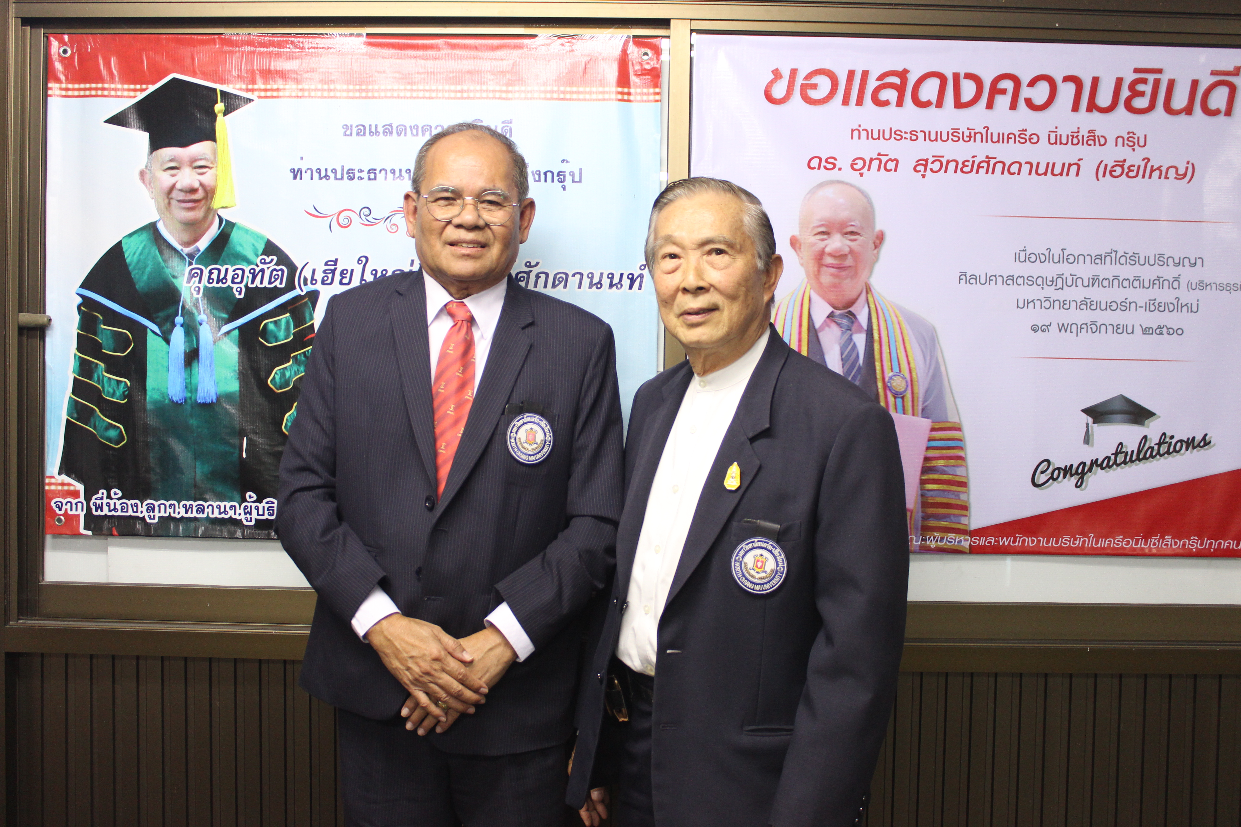 อาจารย์ณรงค์ ชวสินธุ์ อธิการบดี และ ดร.วิวัฒน์ เศรษฐช่วย ที่ปรึกษาอธิการบดี มอบบทความเกี่ยวกับชีวิตของ ดร.อุทัต สุวิทย์ศักดานนท์ ที่บรรจุใส่กรอบอันสวยงาม โดยบทความมีทั้งภาษาไทย ภาษาอังกฤษและภาษาจีน ณ บริษัท นิ่มซีเส็ง ลิสซิ่ง