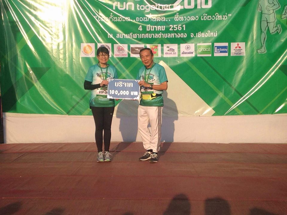 อาจารย์ณรงค์ ชวสินธุ์ อธิการบดีมหาวิทยาลัยนอร์ท-เชียงใหม่ บริจาคเงินจำนวน 100,000 บาท แก่ แพทย์หญิงนลินทิพย์ ธรรมฤกษ์ฤทธิ์ ผู้อำนวยการโรงพยาบาลหางดง ในงานเดิน-วิ่งการกุศล Hangdong Run Together 2018 เพื่อจัดซื้อครุภัณฑ์ทางการแพทย์โรงพยาบาลหางดง จังหวัดเชียงใหม่