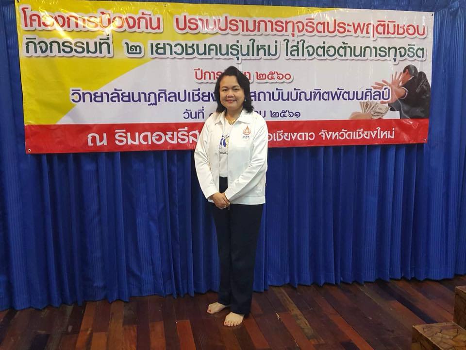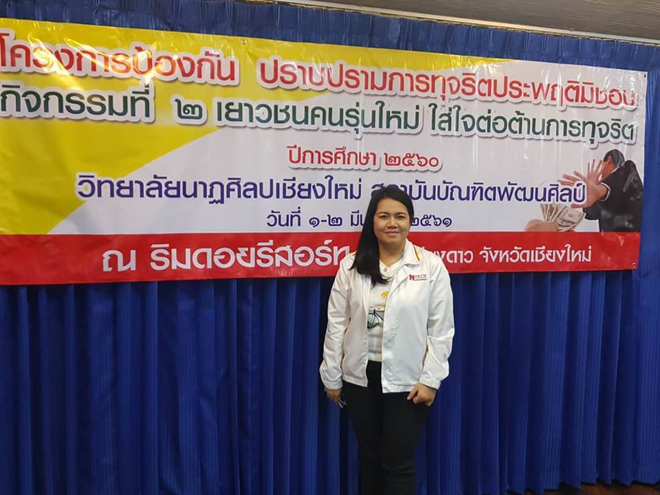 ผู้ช่วยศาสตราจารย์บงกช สุทัศน์ ณ อยุธยา และอาจารย์อิสรีย์ ขาวทวีรัชต์ เป็นวิทยากรโครงการป้องกันปราบปรามการทุจริตประพฤติมิชอบ กิจกรรมที่ 2 เยาวชนคนรุ่นใหม่ใส่ใจต่อต้านการทุจริต ประจำปีการศึกษา 2560 จัดโดยวิทยาลัยนาฏศิลป์เชียงใหม่ ณ ริมดอยรีสอร์ท อำเภอเชียงดาว จังหวัดเชียงใหม่ เมื่อวันที่ 1-2 มีนาคม 2561