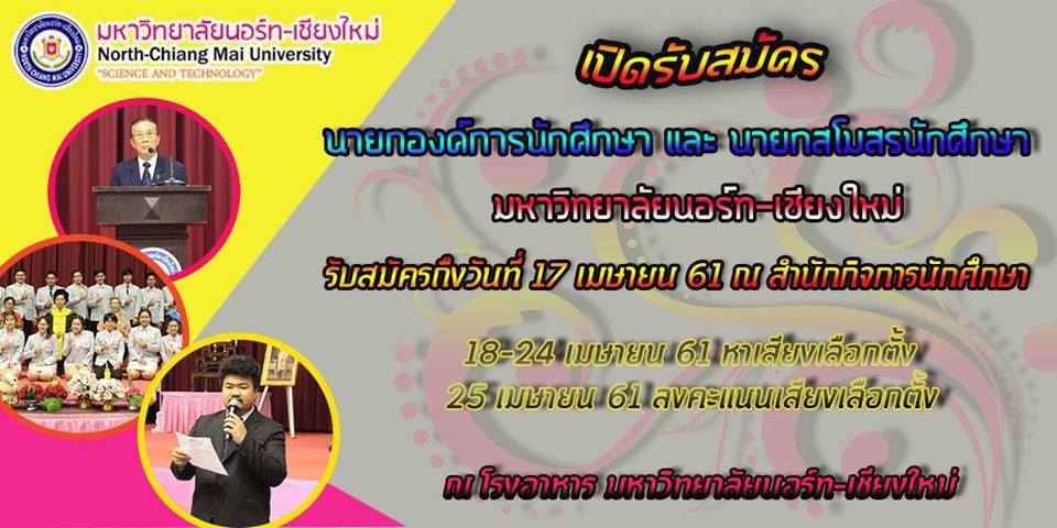 หน้าแรก >> รับสมัครนายกองค์การนักศึกษาและนายกสโมสรนักศึกษา ประจำปีการศึกษา 2561 สนใจสามารถติดต่อสอบถามได้ที่สำนักกิจการนักศึกษา โทร 053-819931 นะจ๊ะ