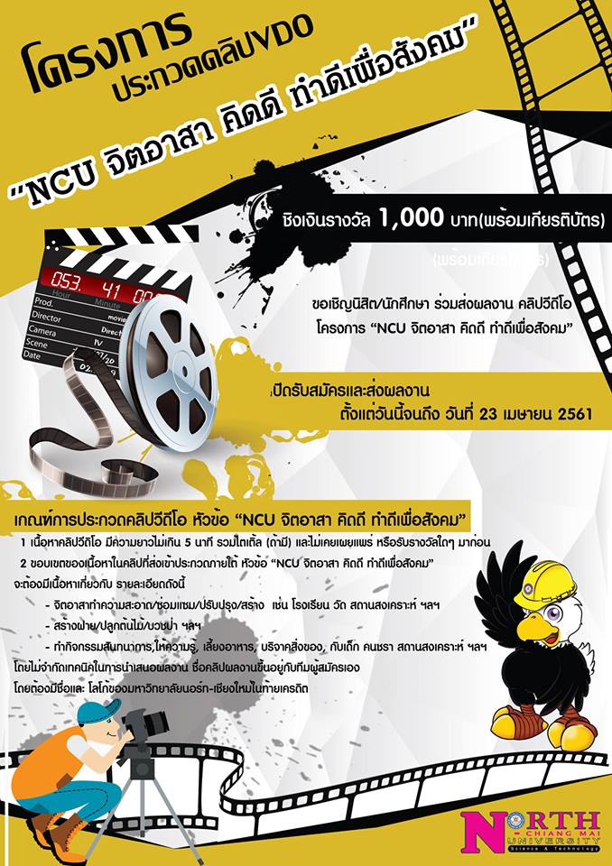 ขอเชิญนิสิต นักศึกษา ร่วมส่งผลงานคลิป VDO "NCU จิตอาสา คิดดี ทำดีเพื่อสังคม" ชิงเงินรางวัล 1,000 บาท(พร้อมเกียรติบัตร) เปิดรับสมัครและส่งผลงาน ตั้งแต่วันนี้ - 23 เมษายน 2561