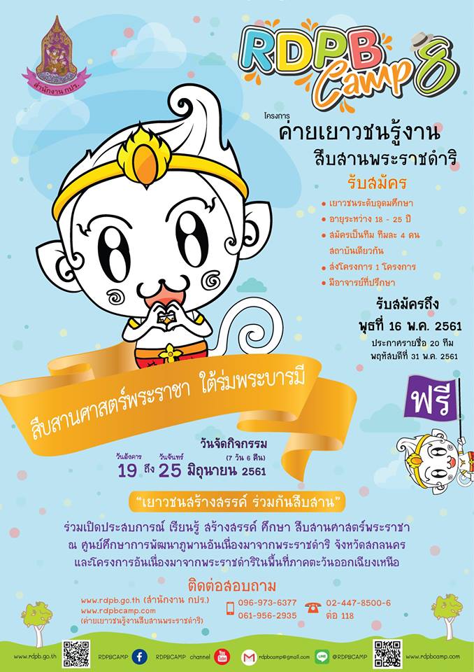 โครงการค่ายเยาวชนรู้งานสืบสานพระราชดำริ (RDPB Camp) รุ่นที่ 8 ประจำปี 2561 จะจัดขึ้นระหว่างวันอังคารที่ 19 – จันทร์ที่ 25 มิถุนายน 2561 โดยจะได้เรียนรู้ทั้งภาคทฤษฎีและภาคปฏิบัติในพื้นที่ศูนย์ศึกษาการพัฒนาภูพานอันเนื่องมาจากพระราชดำริ จังหวัดสกลนคร และโครงการอันเนื่องมาจากพระราชดำริในเขตพื้นที่ภาคตะวันออกเฉียงเหนือ นักศึกษาที่สนใจอยากร่วมโครงการ หรืออยากทราบรายละเอียดเพิ่มเติม แจ้งความจำนงผ่านคณะได้ หรือดูรายละเอียดเพิ่มเติมก่อนได้ที่: www.rdpbcamp.com หรือ