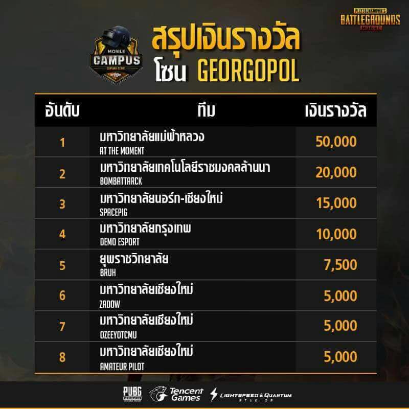 ที่ได้รับรองวัลรองชนะเลิศอันดับที่ 2 ในการแข่งขัน PUBG Mobile Campus Survival Series (E-Sport) โซน Georgopol ภาคเหนือ และเป็น 1 ในตัวแทนทีมจากภาคเหนือเข้าแข่งขันในรอบชิงชะเลิศแห่งประเทศไทย
