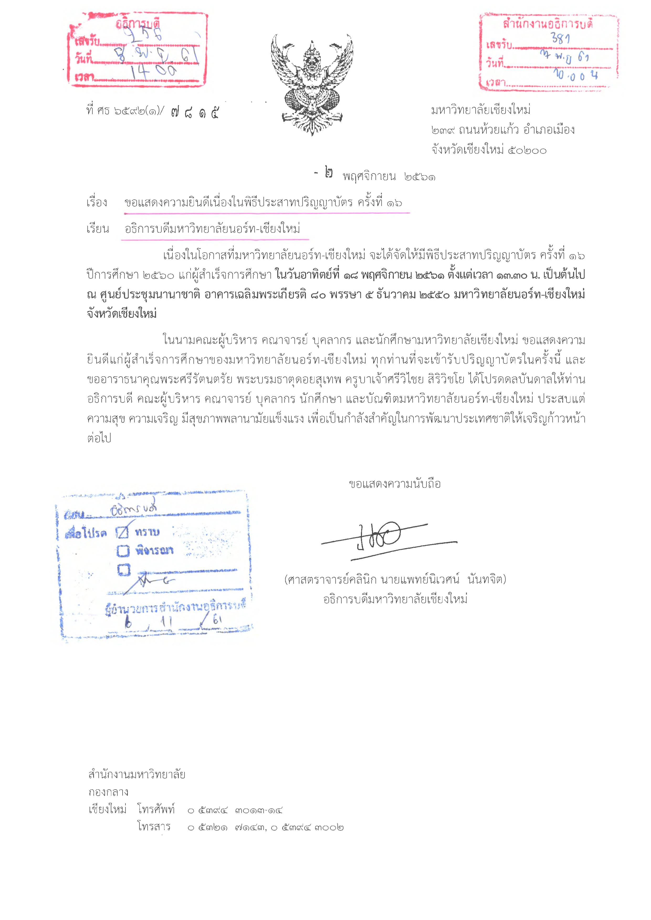ศาสตร์จารย์คลินิก นายแพทย์นิเวศน์ นันทจิต อธิการบดีมหาวิทยาลัยเชียงใหม่ ได้ส่งจดหมายขอแสดงความยินดีเนื่องในพิธีประสาทปริญญาบัตรครั้งที่ 16 ของ