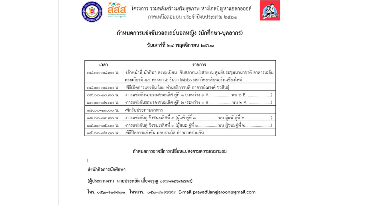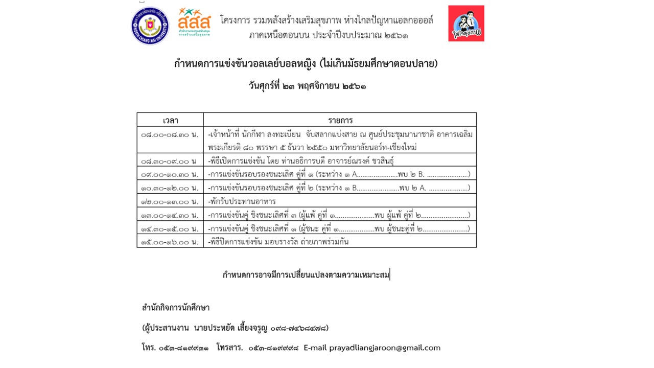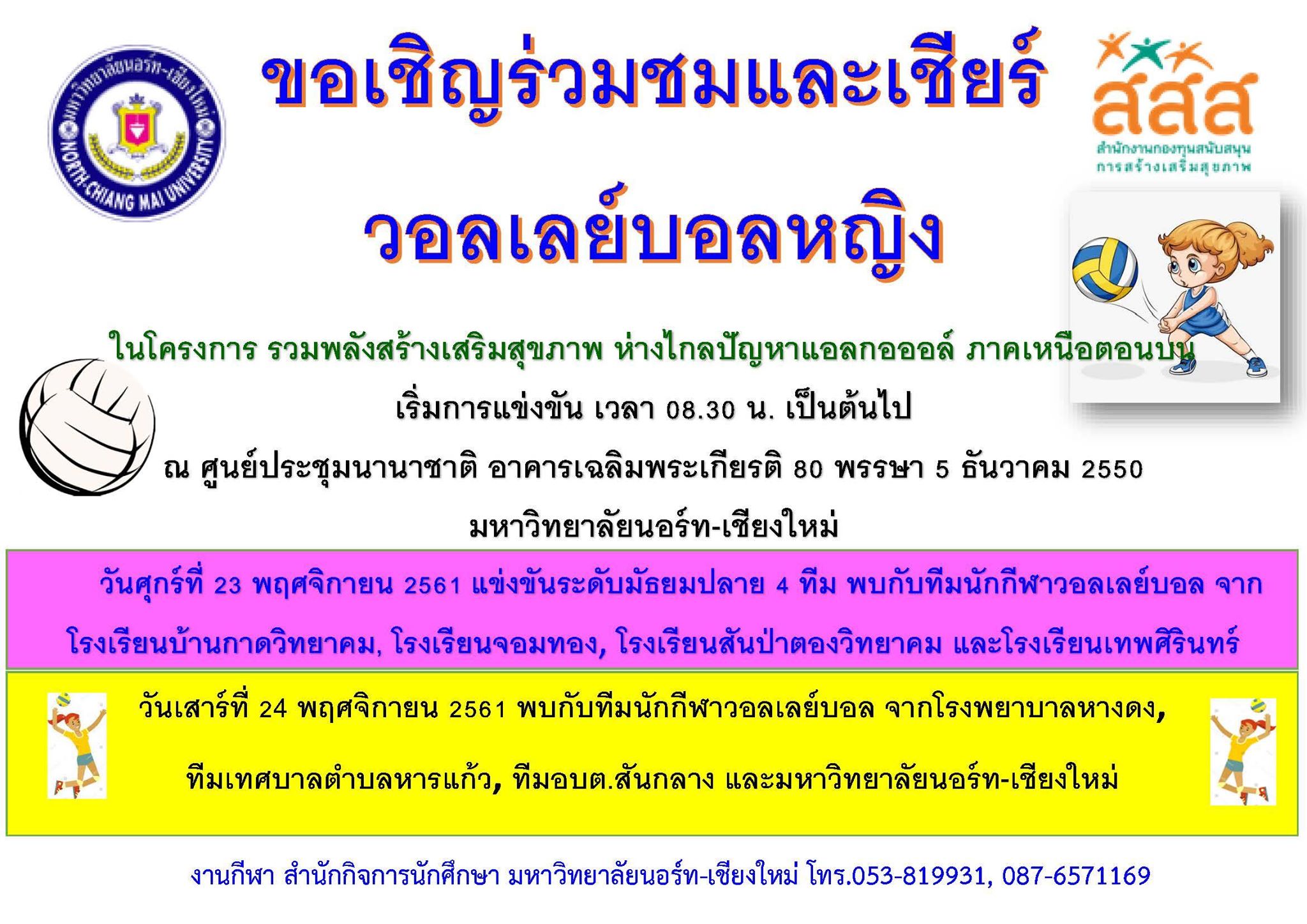 ขอเชิญชมและเชียร์ วอลเลย์บอลหญิง ในโครงการ รวมพลังสร้างเสริมสุขภาพ ห่างไกลปัญหาแอลกฮออล์ ภาคเหนือตอนบน ณ ศูนย์ประชุมนานาชาติ อาคารเฉลิมพระเกียรติ 80 พรรษา 5 ธันวาคม 2550 มหาวิทยาลัยนอร์ท - เชียงใหม่