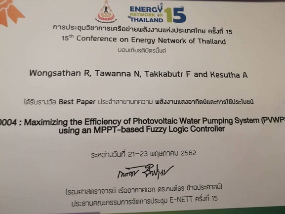 ในโอกาสนี้ขอแสดงความยินดี เนื่องในโอกาสที่ บทความดังกล่าวได้รับรางวัล "Best Paper ประจำสาขาบทความ พลังงานแสงและอาทิตย์และการใช้ประโยชน์" ในวันที่ 23 พฤษภาคม 2562