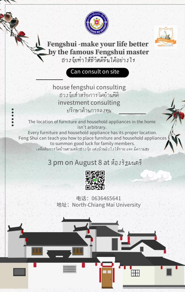 มหาวิทยาลัยนอร์ท-เชียงใหม่ ขอเชิญอาจารย์ นักศึกษา และบุคคลทั่วไปเข้าฟังศาสตร์ฮวงจุ้ย สำหรับการจัดบ้านที่ดี และปรึกษาด้านการลงทุน