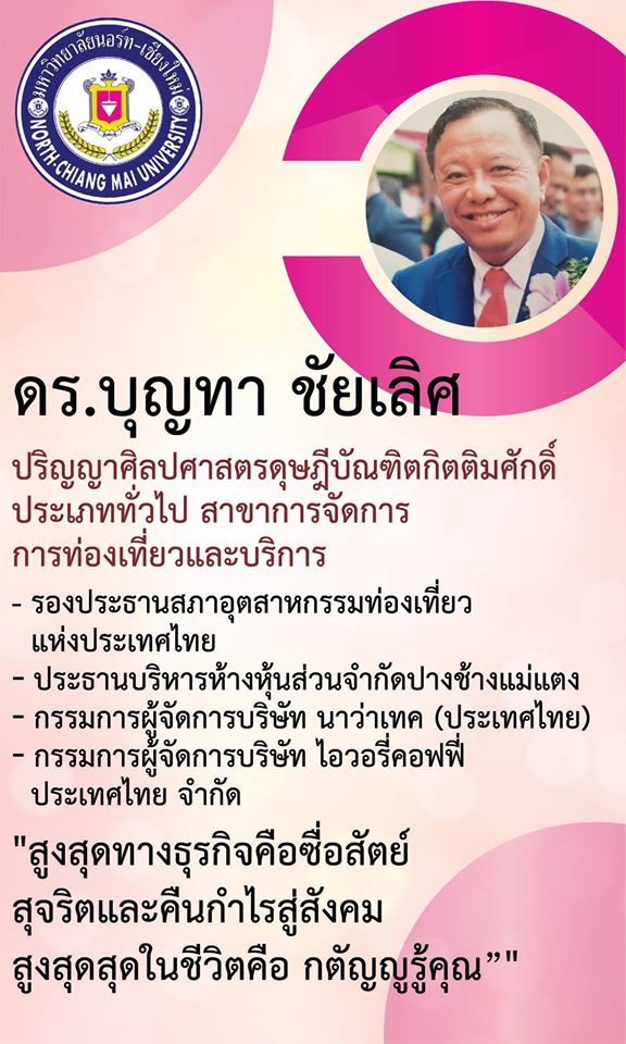 ดร.บุญทา ชัยเลิศ รองประธานสภาอุตสาหกรรมท่องเที่ยวแห่งประเทศไทย , ประธานบริหารห้างหุ้นส่วนจำกัดปางช้างแม่แตง , กรรมการผู้จัดการบริษัทนาว่าเทค (ปรเทศไทย) , กรรมการผู้จัดการบริษัทไอวอรี่คอฟฟี่ ประเทศไทย จำกัด