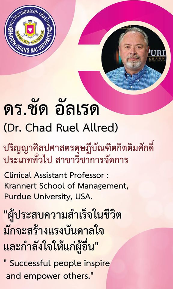 สภามหาวิทยาลัยนอร์ท-เชียงใหม่ มีมติเป็นเอกฉันท์ให้ประสาทปริญญาศิลปศาสตรดุษฎีบัณฑิตกิตติมศักดิ์ ประเภททั่วไป สาขาวิชาการจัดการ ให้แก่ Dr. Chad Ruel Allred, Clinical Assistant Professor, Krannert School of Management, Purdue University, USA.