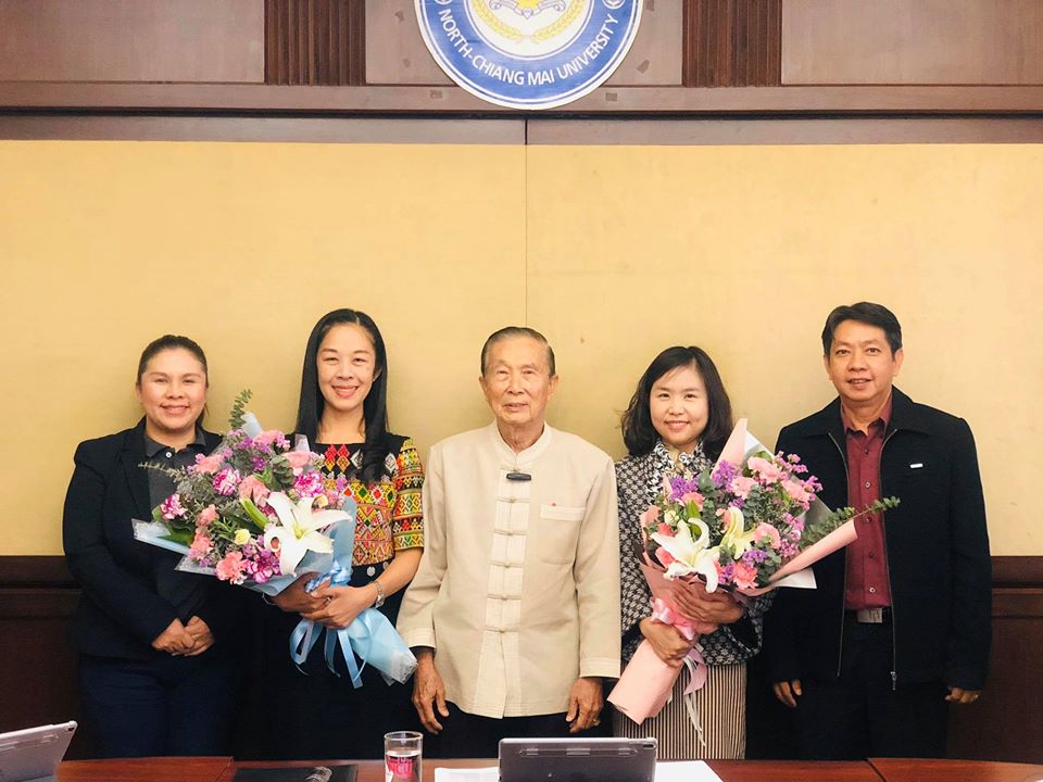 ดร.ณรงค์ ชวสินธุ์ อธิการบดี มหาวิทยาลัยนอร์ท-เชียงใหม่ มอบช่อดอกไม้แสดงความยินดีและชื่นชมกับ