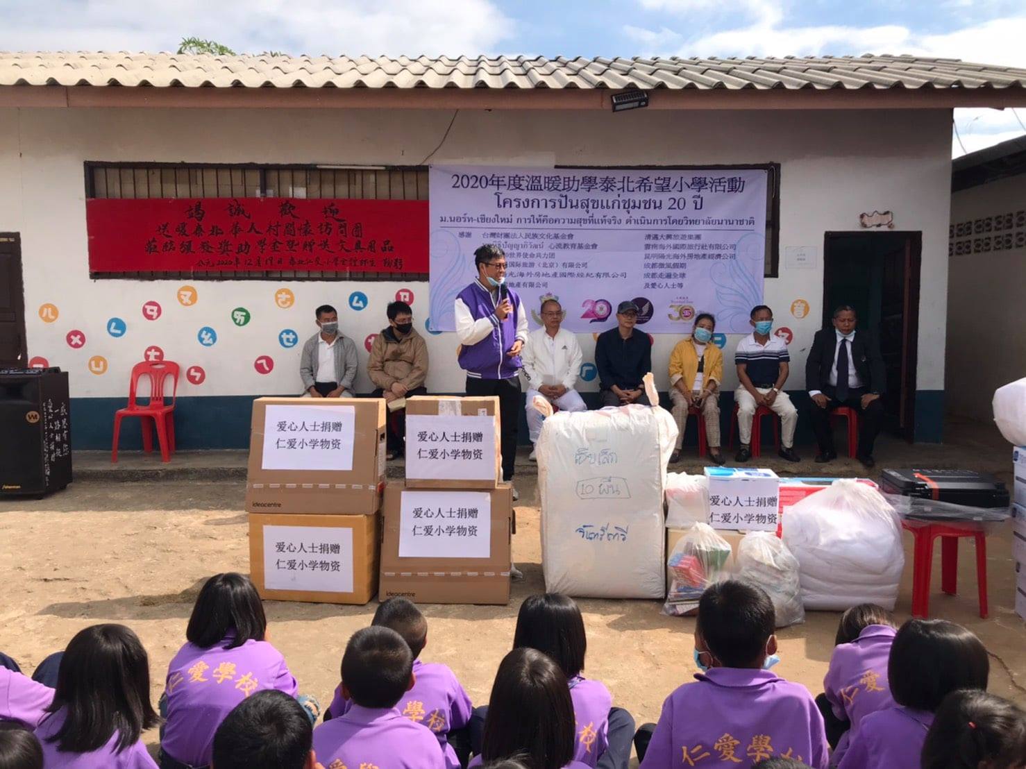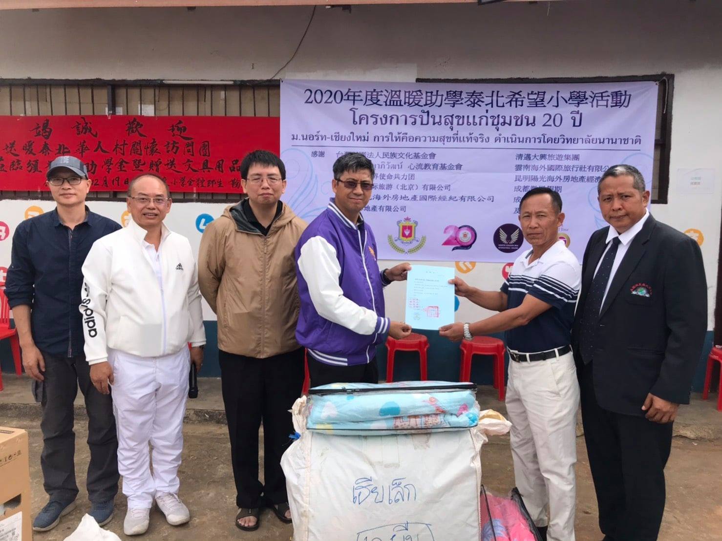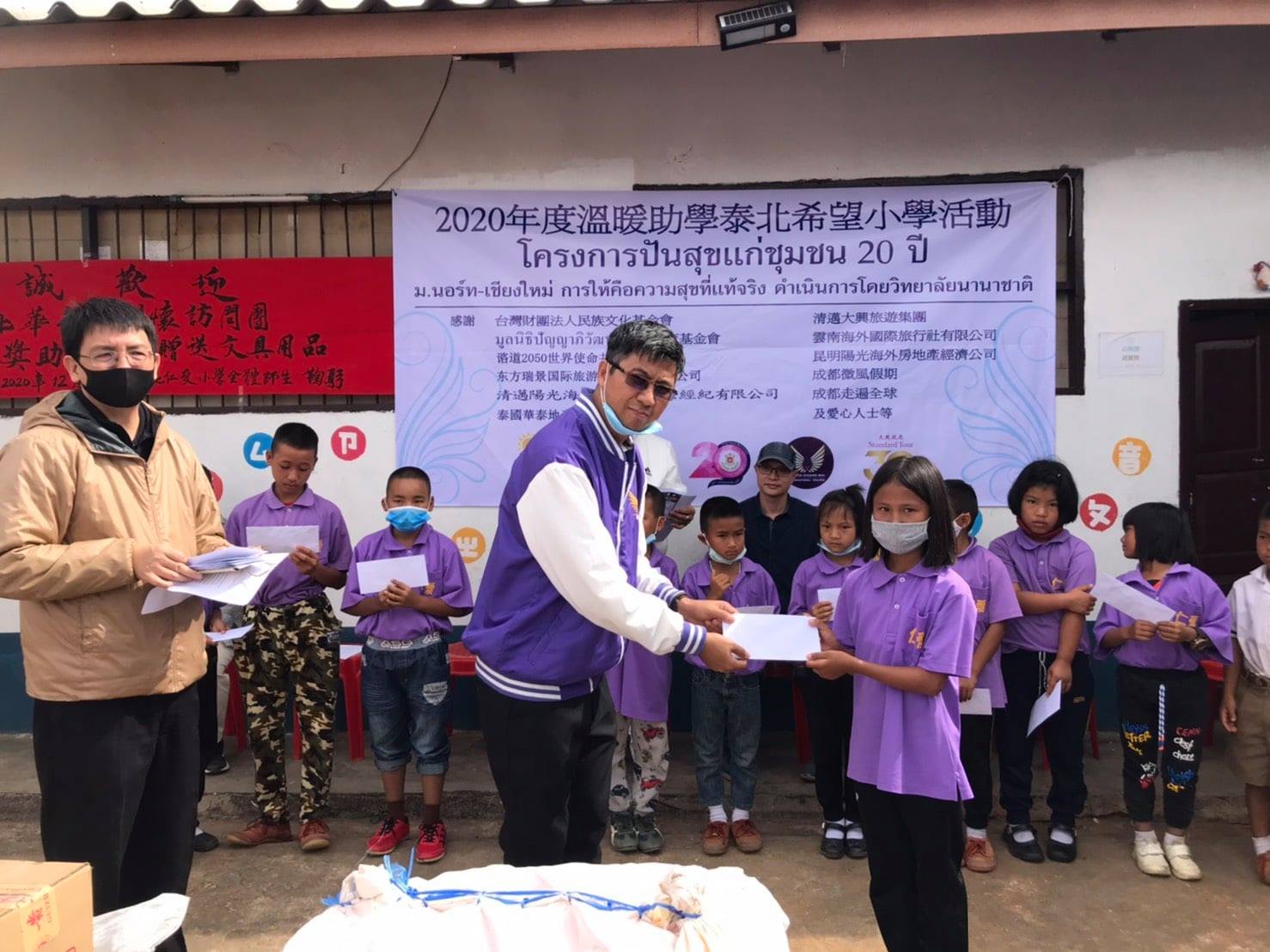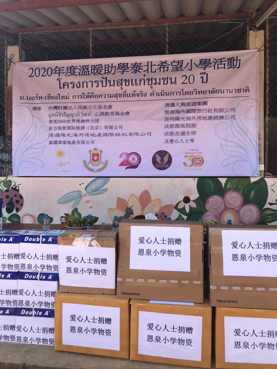 ดร.ภัทรภณ ศิลารักษ์ คณบดีและอาจารย์สามชัย จิระภัทรศิลป รองคณบดี วิทยาลัยนานาชาติ มหาวิทยาลัยนอร์ท-เชียงใหม่ พร้อมกับพันธมิตรบริษัท Sunshine เชียงใหม่ มอบทุนการศึกษาและอุปกรณ์การเรียน รวมทั้งเครื่องอุปโภค บริโภค ให้แก่นักเรียนโรงเรียนจีนเหรินอ้าย และโรงเรียนเอินฉวน บริเวณพื้นที่ราบสูง บ้านเทอดไทย อำเภอแม่ฟ้าหลวง จังหวัดเชียงราย ในโครงการ "ปันสุขแก่ชุมชนบนพื้นที่ราบสูง" เนื่องในโอกาส 20 ปี มหาวิทยาลัยนอร์ท-เชียงใหม่ เพื่อมอบความสุข พัฒนาคุณภาพชีวิตและส่งเสริมการศึกษาให้กับนักเรียนพื้นที่ราบสูง จัดขึ้นเมื่อวันที่ 18-19 ธันวาคม 2563