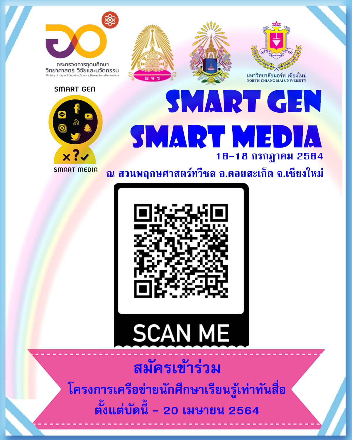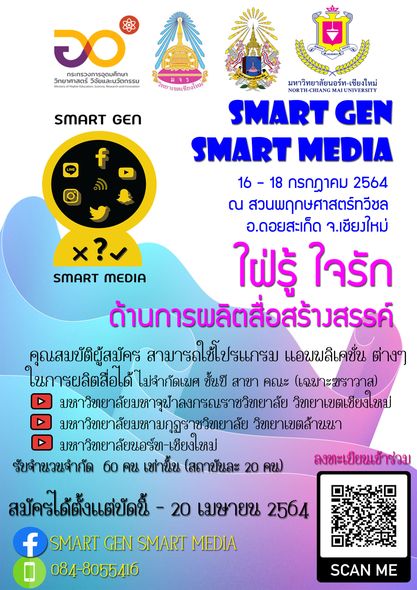 ขอเชิญชวนนักศึกษา ใฝ่รู้ ใจรัก ด้านการผลิตสื่อสร้างสรรค์ เข้าร่วมโครงการเครือข่ายนักศึกษาเรียนรู้เท่าทันสื่อ "SMART GEN SMART MEDIA" ระหว่างวันที่ 16-18 กรกฎาคม 2564 ณ สวมพฤกษศาสตร์ทวีชล อำเภอดอยสะเก็ด จังหวัดเชียงใหม่ สมัครได้ตั้งแต่บัดนี้ - 20 เมษายน 2564