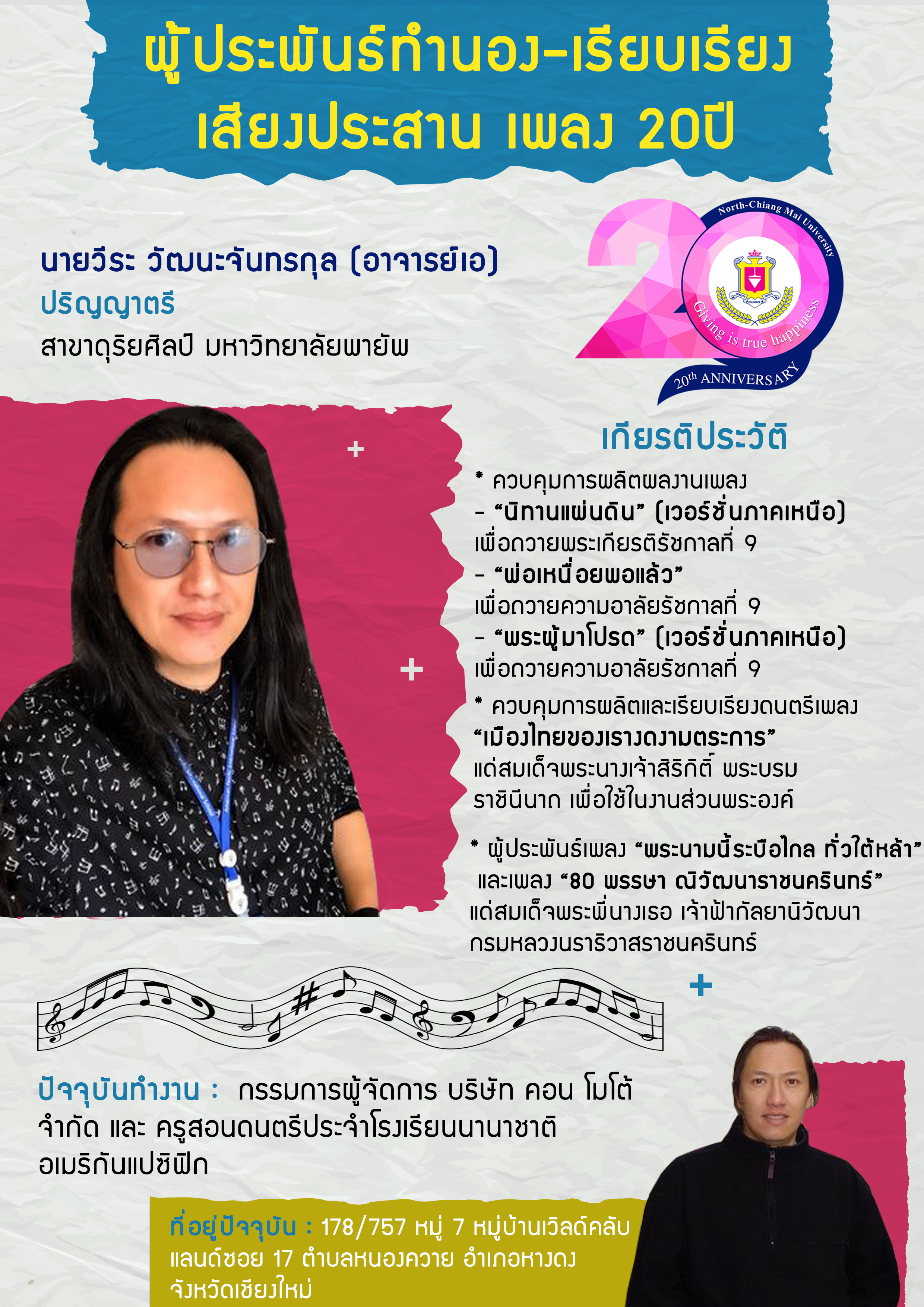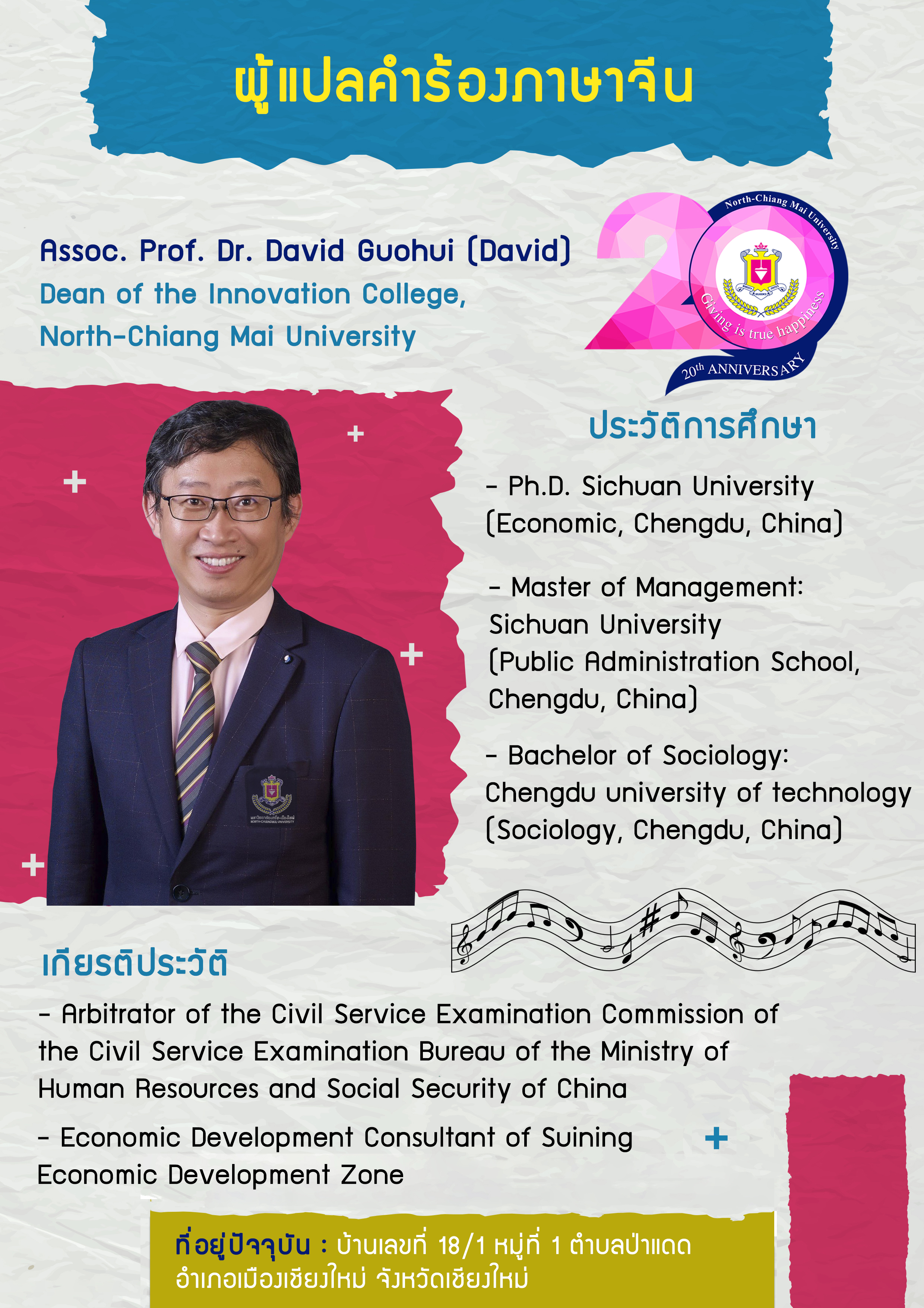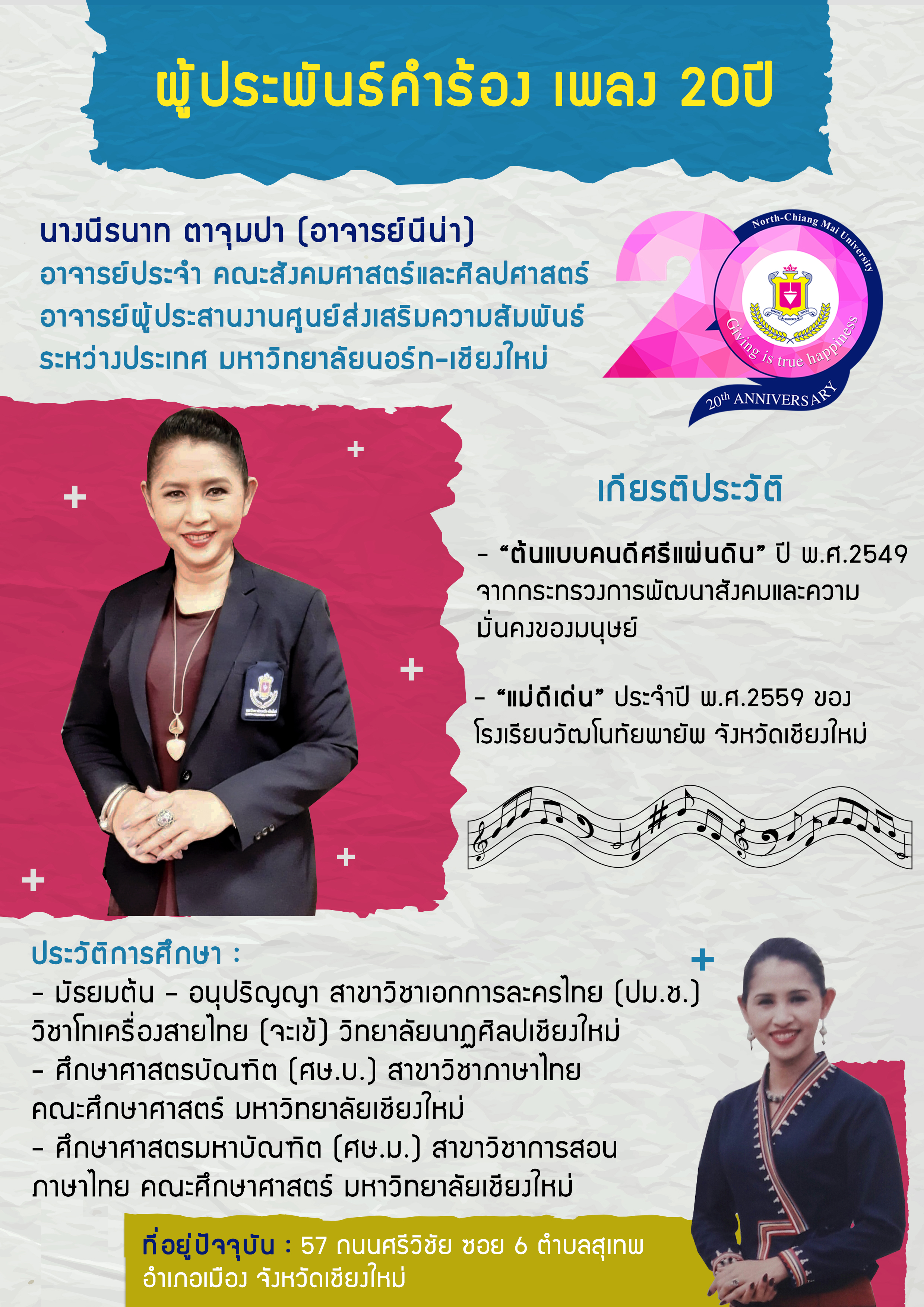 หน้าแรก >> เพลง 20 ปี NCU ผู้ประพันธ์ทำนอง-เรียบเรียงเสียงประสาน ผู้ประพันธ์คำร้อง ผู้แปลบทประพันธ์ภาษาอังกฤษ และผู้แปลบทประพันธ์ภาษาจีน