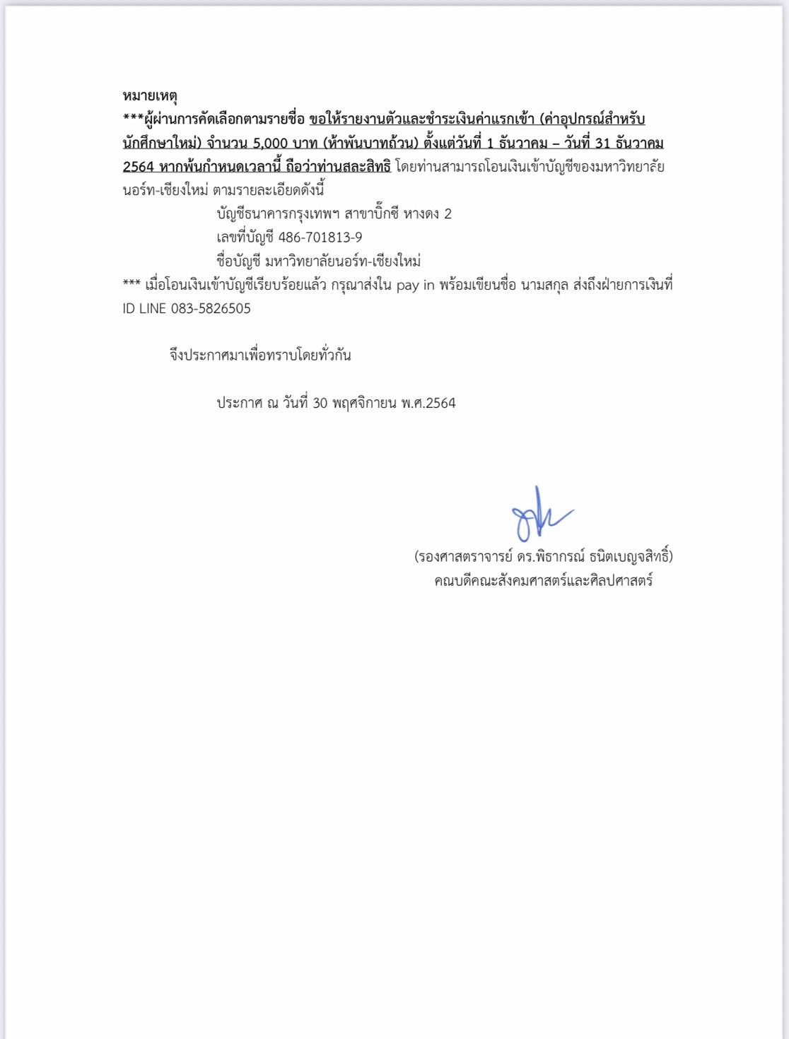 **ขอให้ท่านรายงานตัวโดยชำระเงินค่าอุปกรณ์สำหรับนักศึกษาใหม่ ภายในวันที่ 31 ธันวาคม 2564