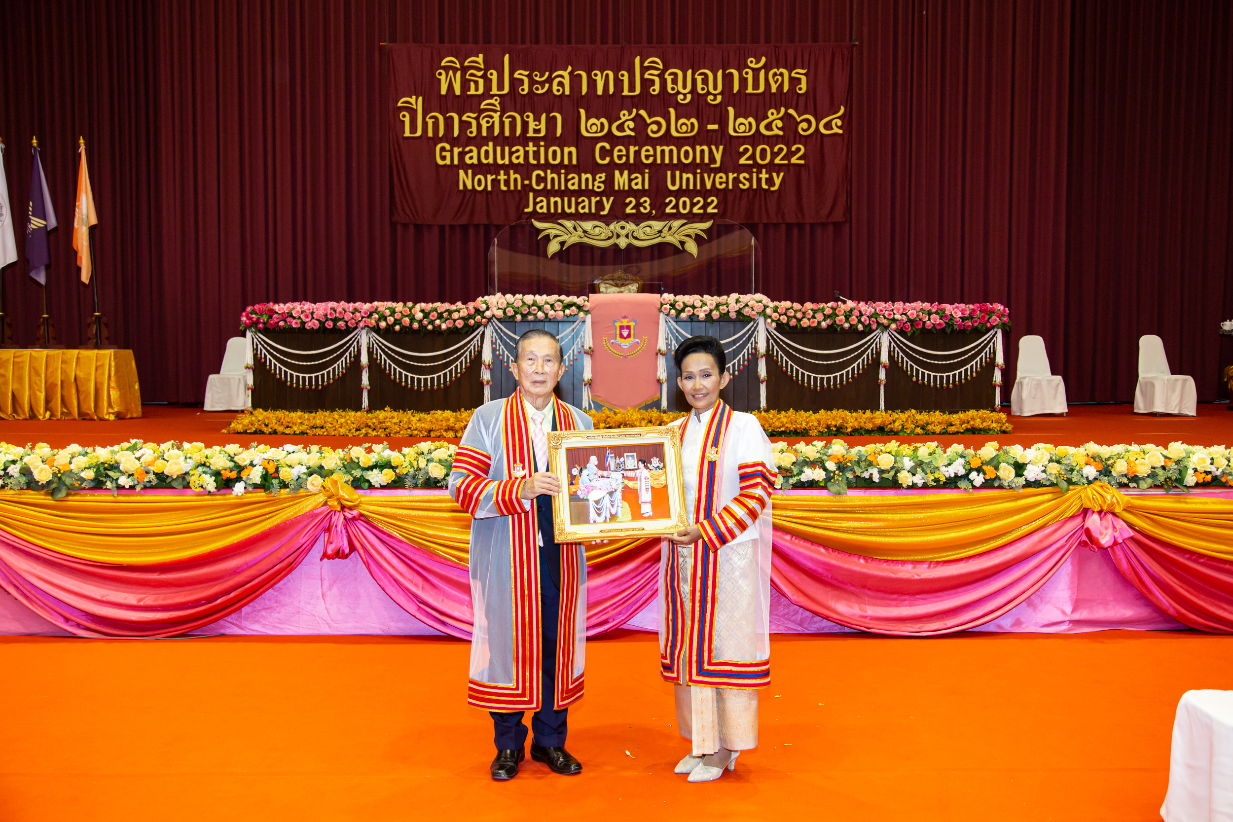 ดร.ณรงค์ ชวสินธุ์ อธิการบดีมหาวิทยาลัยนอร์ท-เชียงใหม่ มอบภาพถ่ายเป็นของที่ระลึก แก่ นางพยง แสนกมล เจ้าของกิจการ ฟาร์มเห็ด “ครูพยง-อนันต์” เนื่องในพิธีประสาทปริญญาบัตรประจำปีการศึกษา 2562 2563 2564