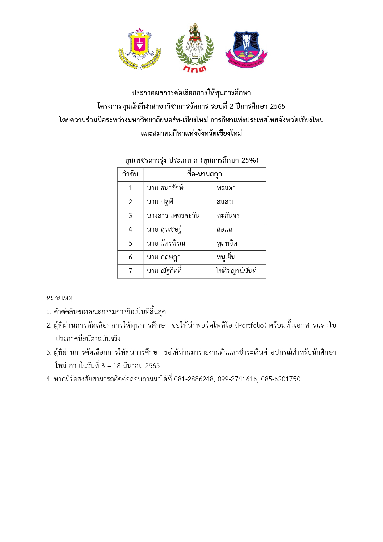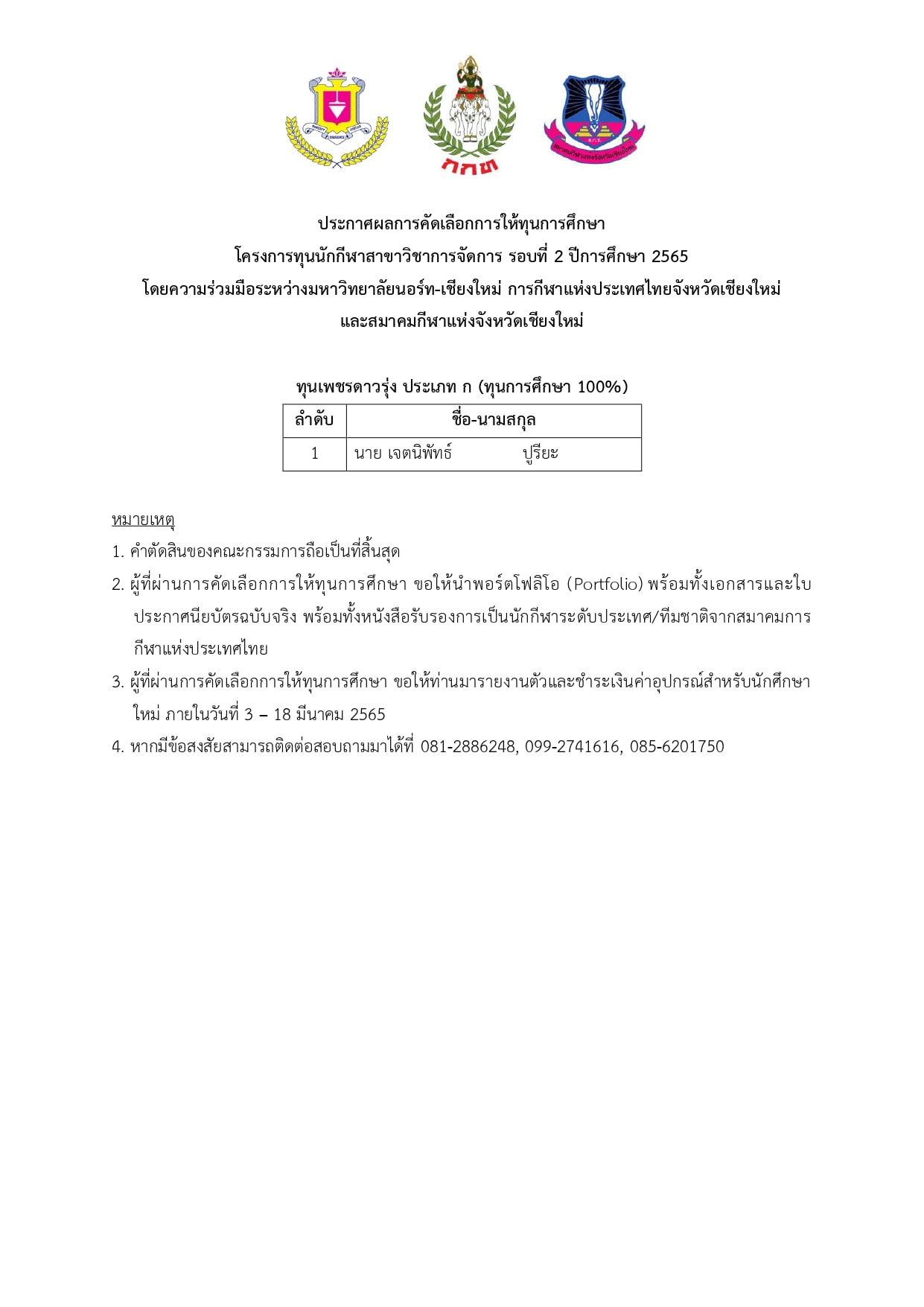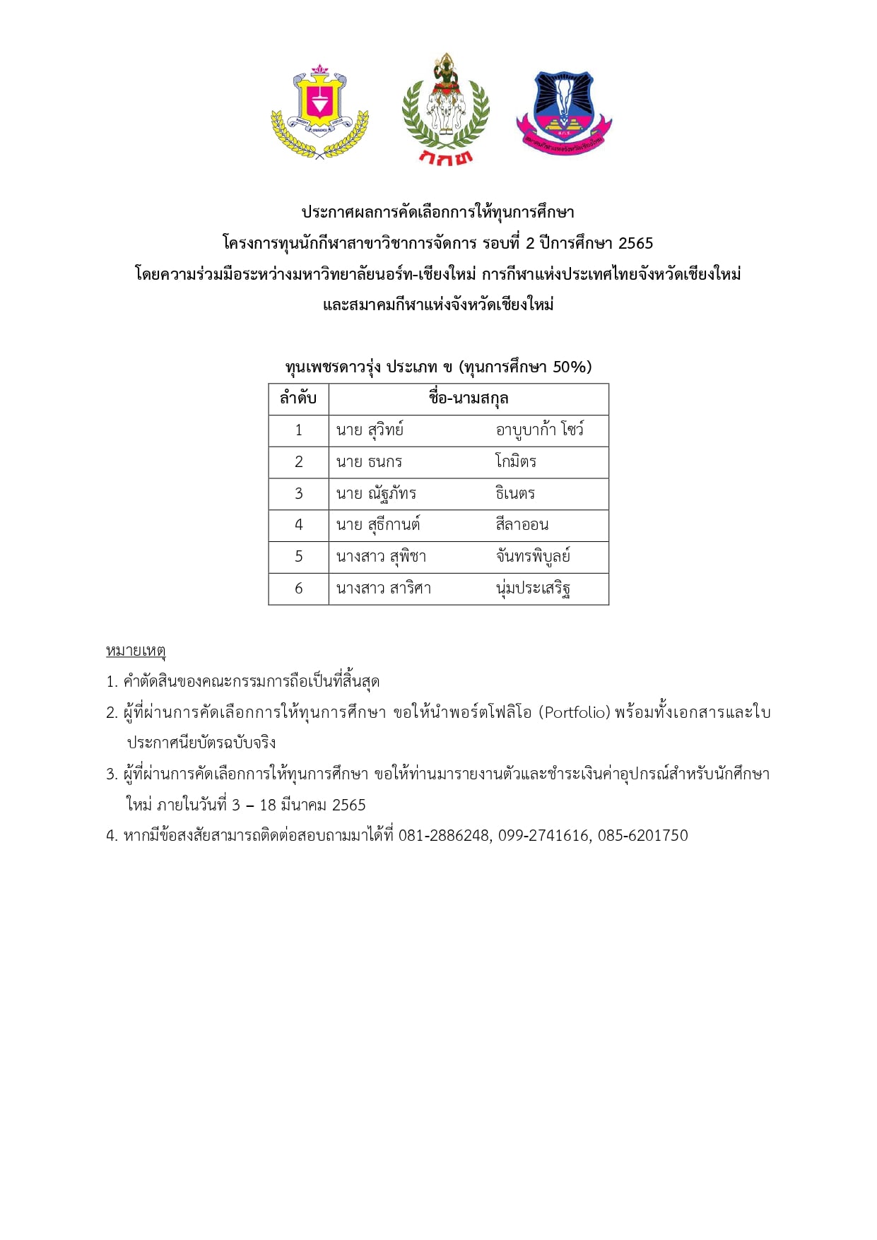 โครงการทุนนักกีฬาสาขาวิชาการจัดการ รอบที่ 2 ปีการศึกษา 2565