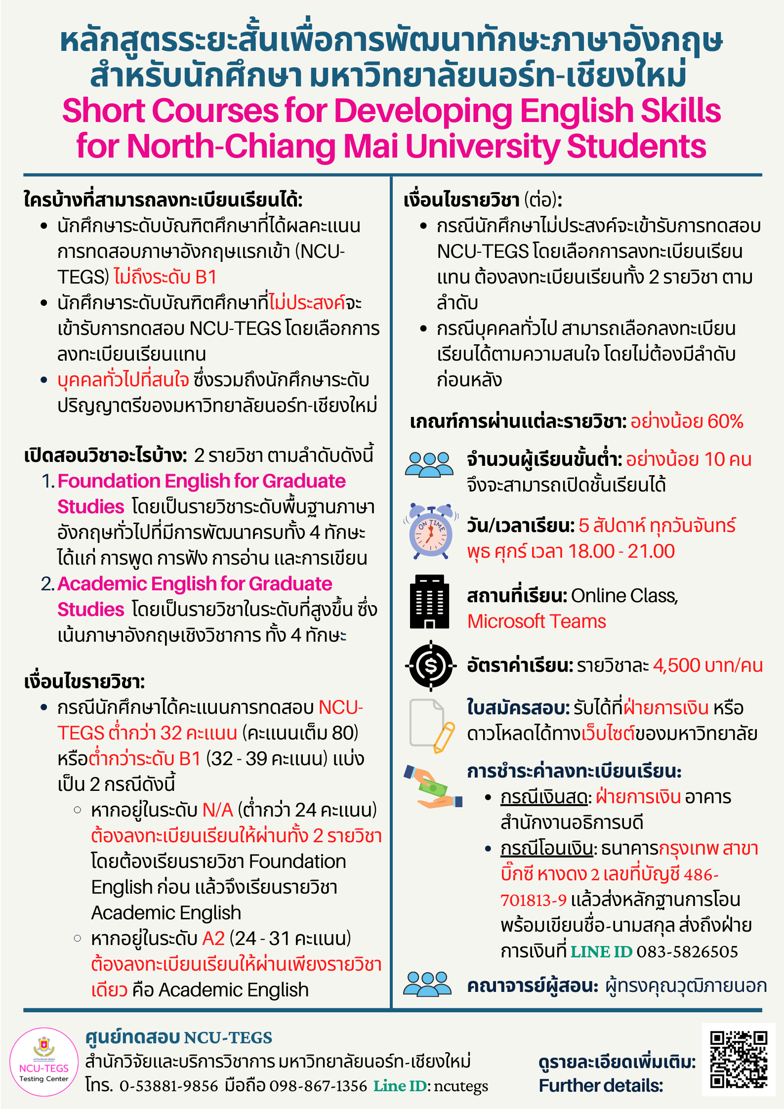 ศูนย์ทดสอบ NCU-TEGS ขอสำรวจความประสงค์ลงทะเบียนเรียนหลักสูตรระยะสั้นเพื่อการพัฒนาทักษะภาษาอังกฤษแรกเข้า สำหรับนักศึกษาระดับบัณฑิตศึกษา มหาวิทยาลัยนอร์ท-เชียงใหม่ รวมถึงผู้สนใจทั่วไป ซึ่งจะเปิดเป็นครั้งที่ 2 ในปลายเดือนเมษายน 2565 นี้ โดยมีรายละเอียดและเงื่อนไขดังนี้