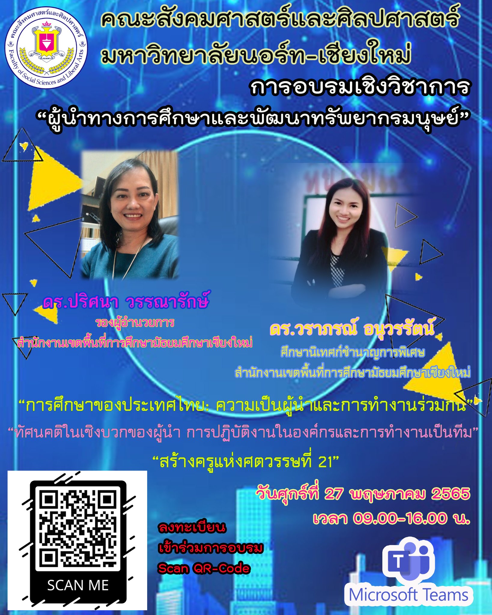 คณะสังคมศาสตร์และศิลปศาสตร์ จัดอบรมเชิงวิชาการ "ผู้นำทางการศึกษาและพัฒนาทรัพยากรมนุษย์" วันที่ 27 พฤษภาคม 2565 เวลา 9.00 - 16.00 น. การอบรมเชิงวิชาการ รายละเอียดตามเอกสารแนบนะคะ