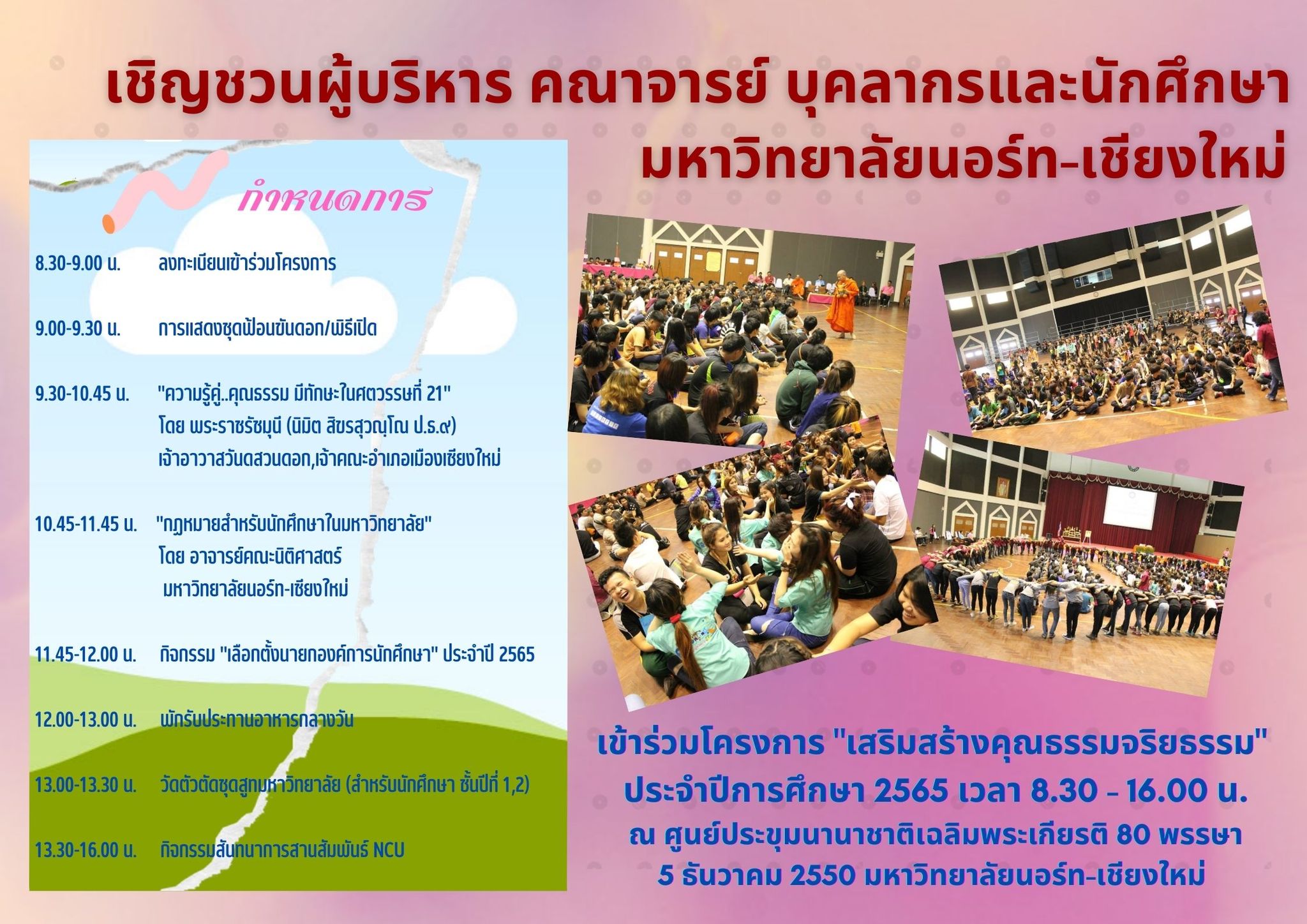ขอเรียนเชิญผู้บริหาร คณาจารย์ บุคลากรและนักศึกษามหาวิทยาลัยนอร์ท - เชียงใหม่ เข้าร่วมโครงการ "เสริมสร้างคุณธรรมจริยธรรม" ประจำปีการศึกษา 2565