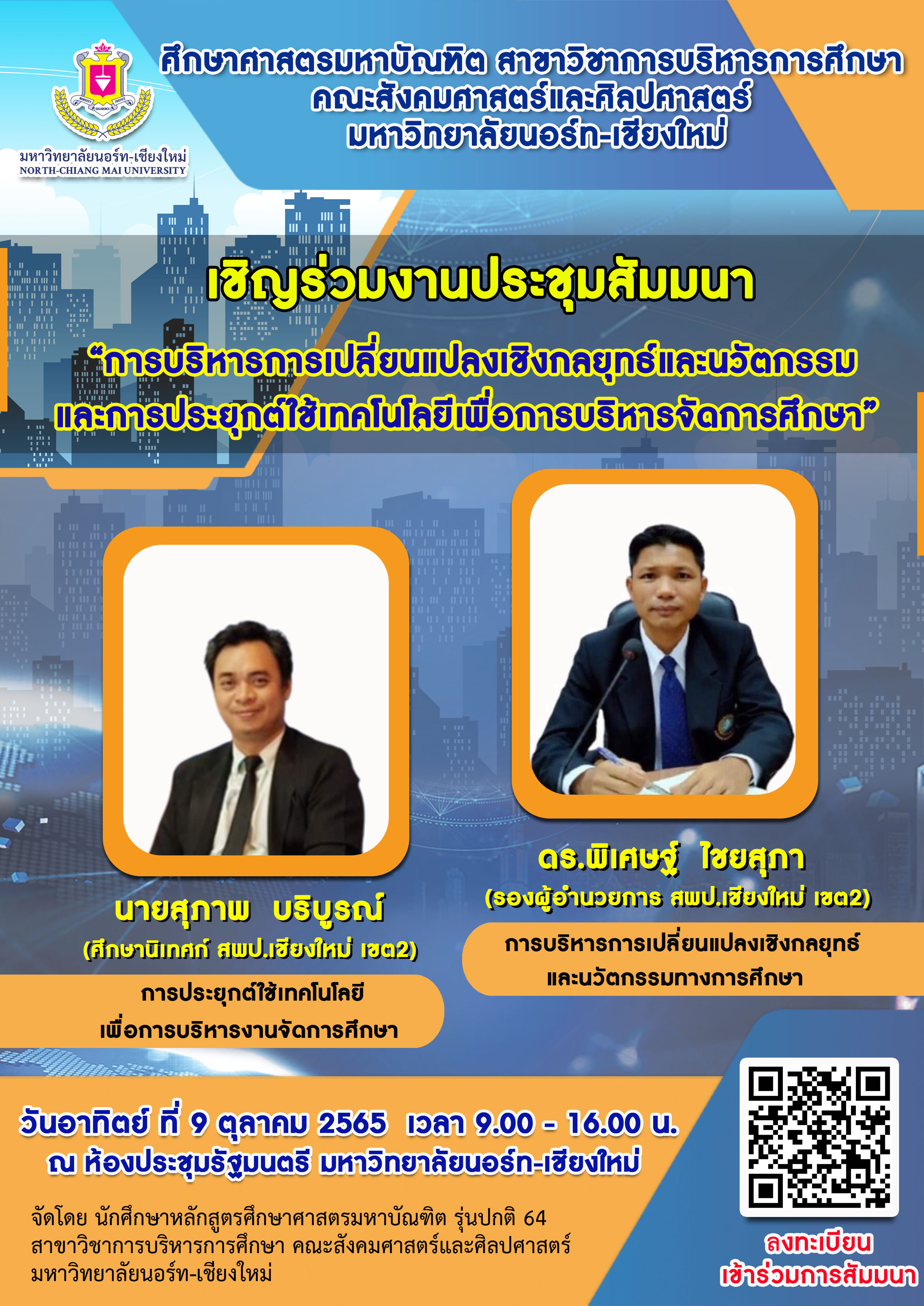 หน้าแรก >> ขอเชิญเข้าร่วมงานประขุมสัมมนา "การบริหารการเปลี่ยนแปลงเชิงกลยุทธ์และนวัตกรรม และการประยุกต์ใช้เทคโนโลยีเพื่อการบริหารจัดการศึกษา" วันอาทิตย์ที่ 9 ตุลาคม 2565 เวลา 9.00 - 16.00 น. ณ ห้องรัฐมนตรี มหาวิทยาลัยนอร์ท-เชียงใหม่