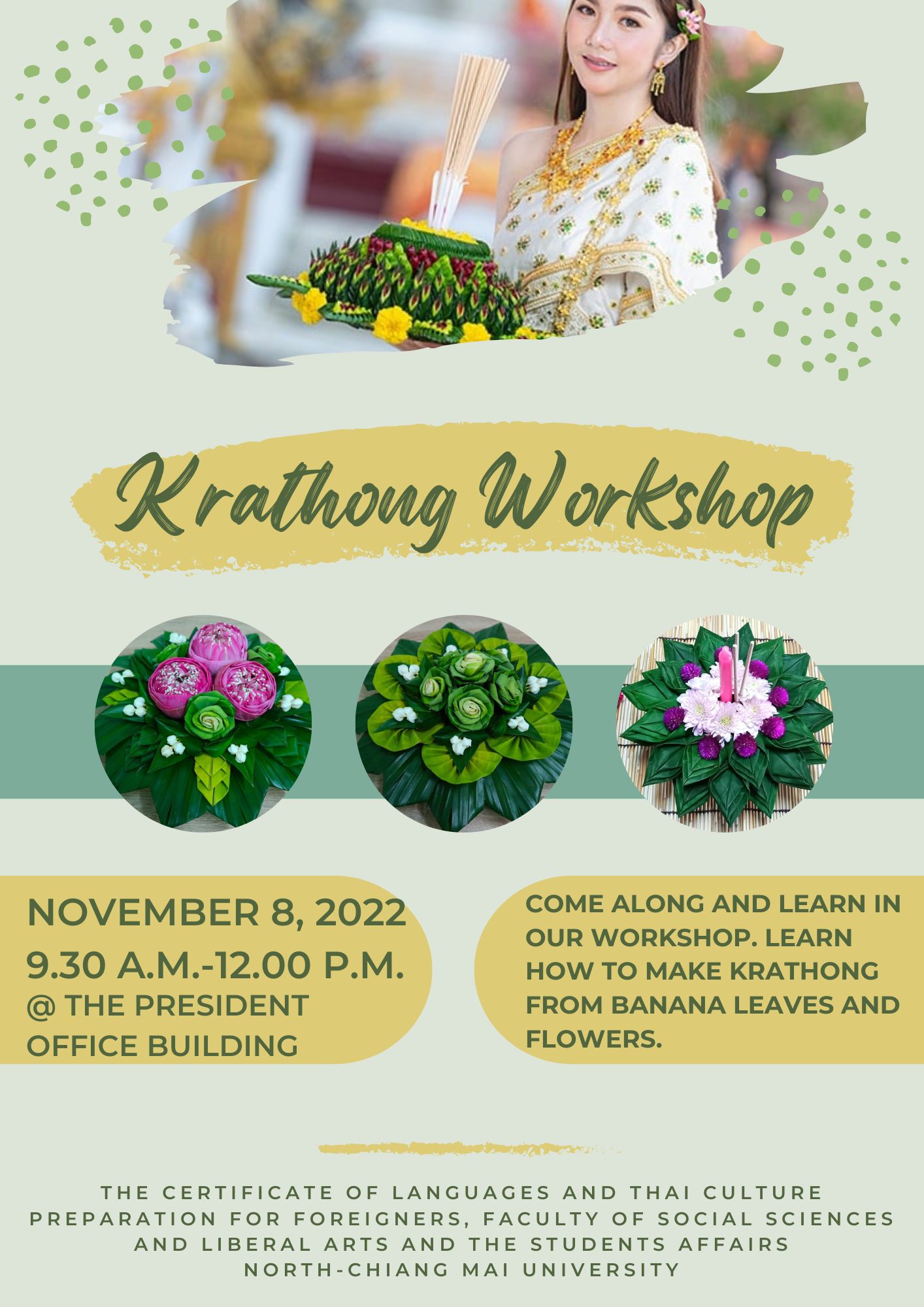 ขอเชิญชวนผู้บริหาร คณาจารย์ บุคลากร และนักศึกษาทุกท่าน ร่วมกิจกรรม "สืบสานประเพณัยี่เป็ง" ประจำปี 2565 วันอังคารที่ 8 พฤศจิกายน 2565 เวลา 9.00- 12.00 น. ณ ชั้น 1 อาคารสำนักงานอธิการบดี จัดโดย สำนักกิจการนักศึกษา ร่วมกับ หลักสูตรประกาศนียบัตรการเตรียมความพร้อมด้านภาษาและวัฒนธรรมไทยสำหรับชาวต่างประเทศ คณะสังคมศาสตร์และศิลปศาสตร์