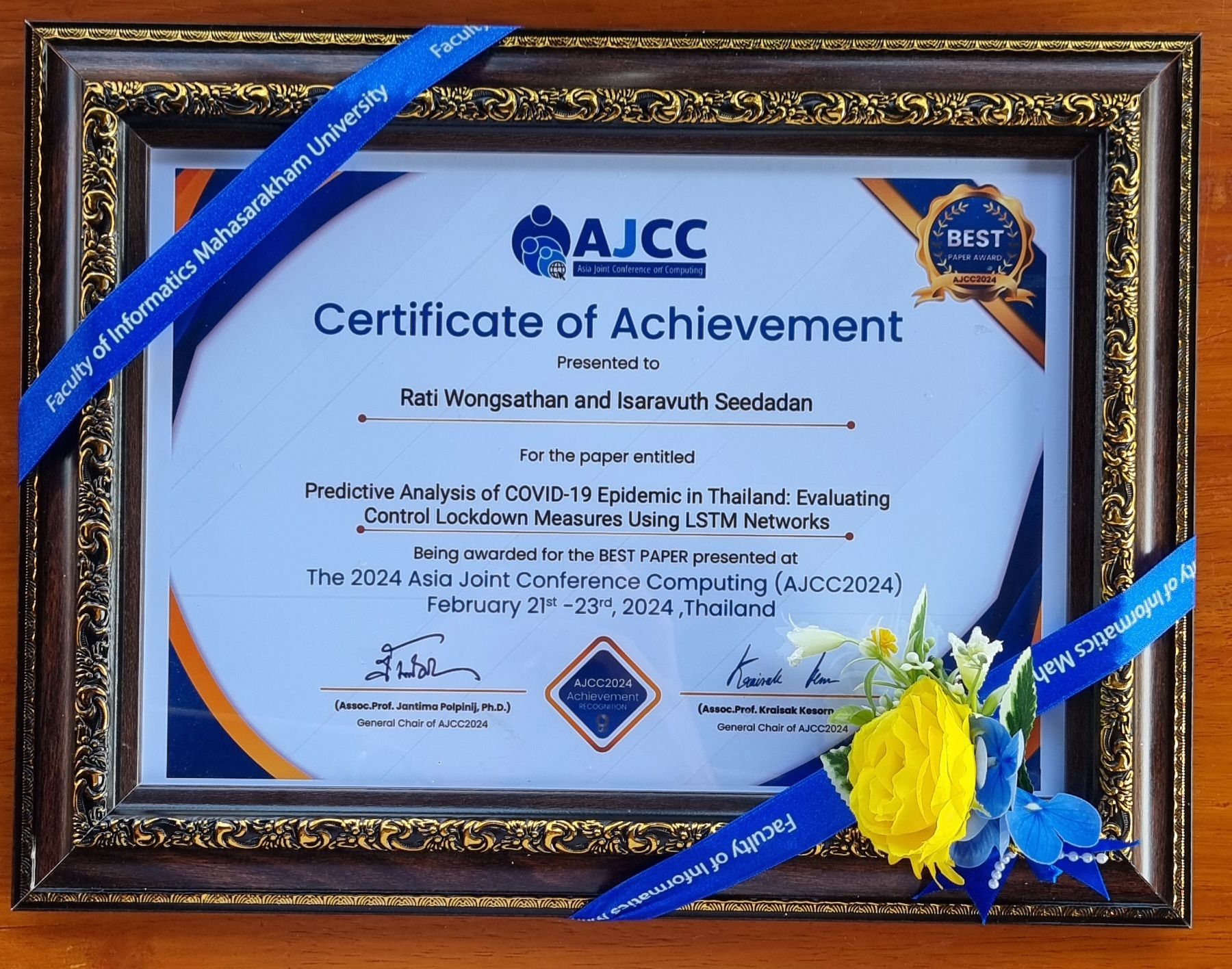 ผู้ช่วยศาสตราจารย์ ดร.รติ วงษ์สถาน และ อาจารย์อิศราวุธ สีดาดาน อาจารย์สาขาวิชาวิศวกรรมไฟฟ้า คณะวิศวกรรมศาสตร์และเทคโนโลยี ได้รับรางวัล Best Paper Award ในการประชุมวิชาการระดับนานาชาติด้านคอมพิวเตอร์ภูมิภาคเอเชีย ครั้งที่ 5 (The 5th Asia Joint Conference on Computing: AJCC 2024) ในบทความเรื่อง "Predictive Analysis of COVID-19 Epidemic in Thailand: Evaluating Control Lockdown Measures using LSTM Networks" เมื่อวันที่ 21 กุมภาพันธ์ 2567 ณ คณะวิทยาการสารสนเทศ มหาวิทยาลัยมหาสารคาม