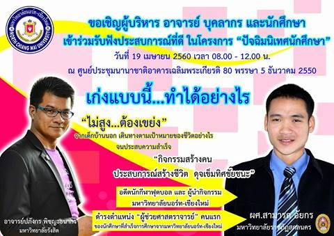 มหาวิทยาลัยนอร์ท-เชียงใหม่ ใคร่ขอเรียนเชิญผู้สนใจเข้าร่วมฟังการบรรยายครั้งนี้ ตามวันเวลาดังกล่าว สอบถามสำนักกิจการนักศึกษา 053-819931 หรือ งานประชาสัมพันธ์ 053-819999