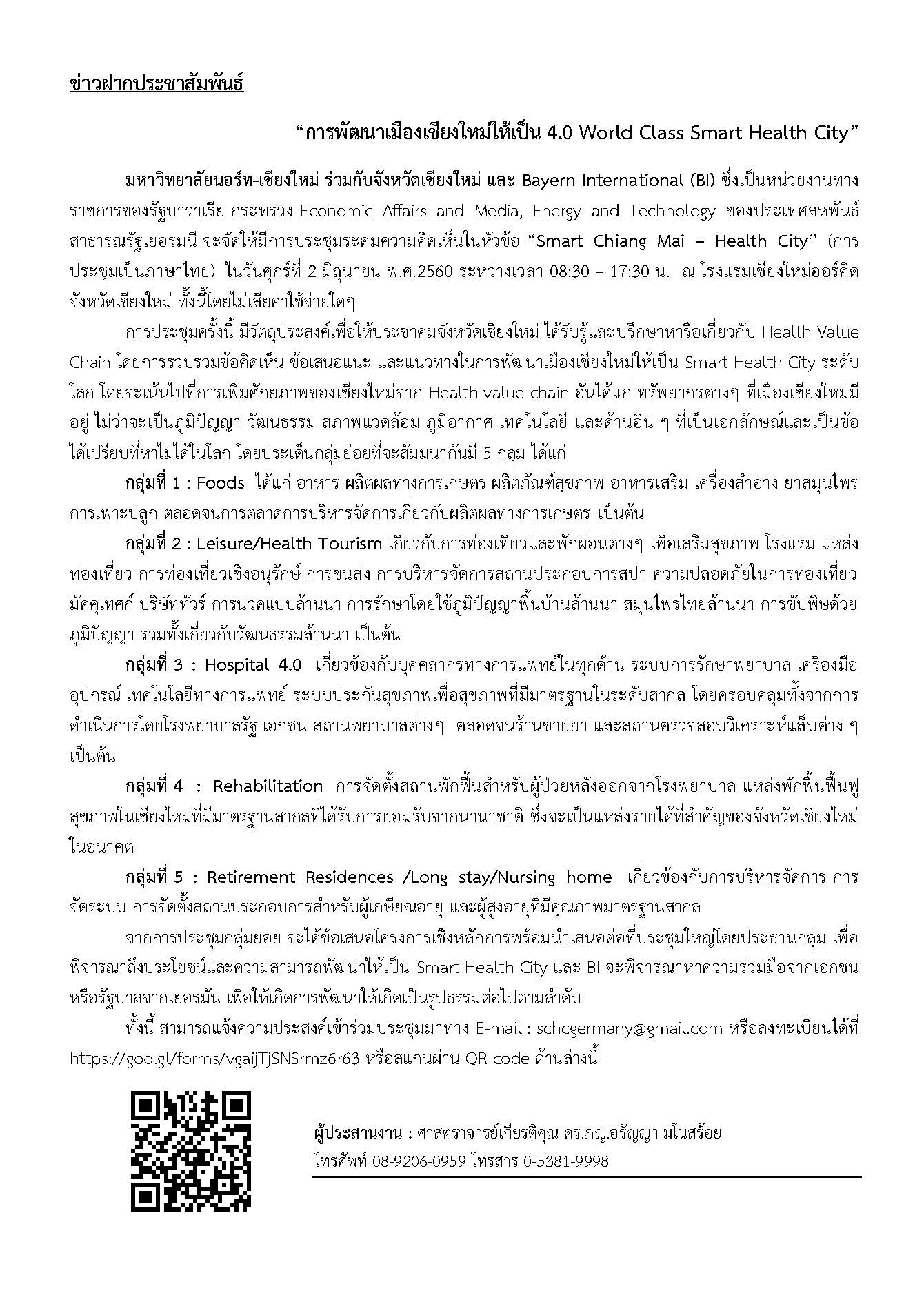 หน้าแรก >> ขอเชิญร่วมงาน การประชุมระดมความคิดเห็นหัวข้อ “Smart Chiang Mai – Health City” วันศุกร์ที่ 2 มิถุนายน พ.ศ. 2560 ระหว่างเวลา 08:30 – 17:30 น. ณ โรงแรมเชียงใหม่ออร์คิด