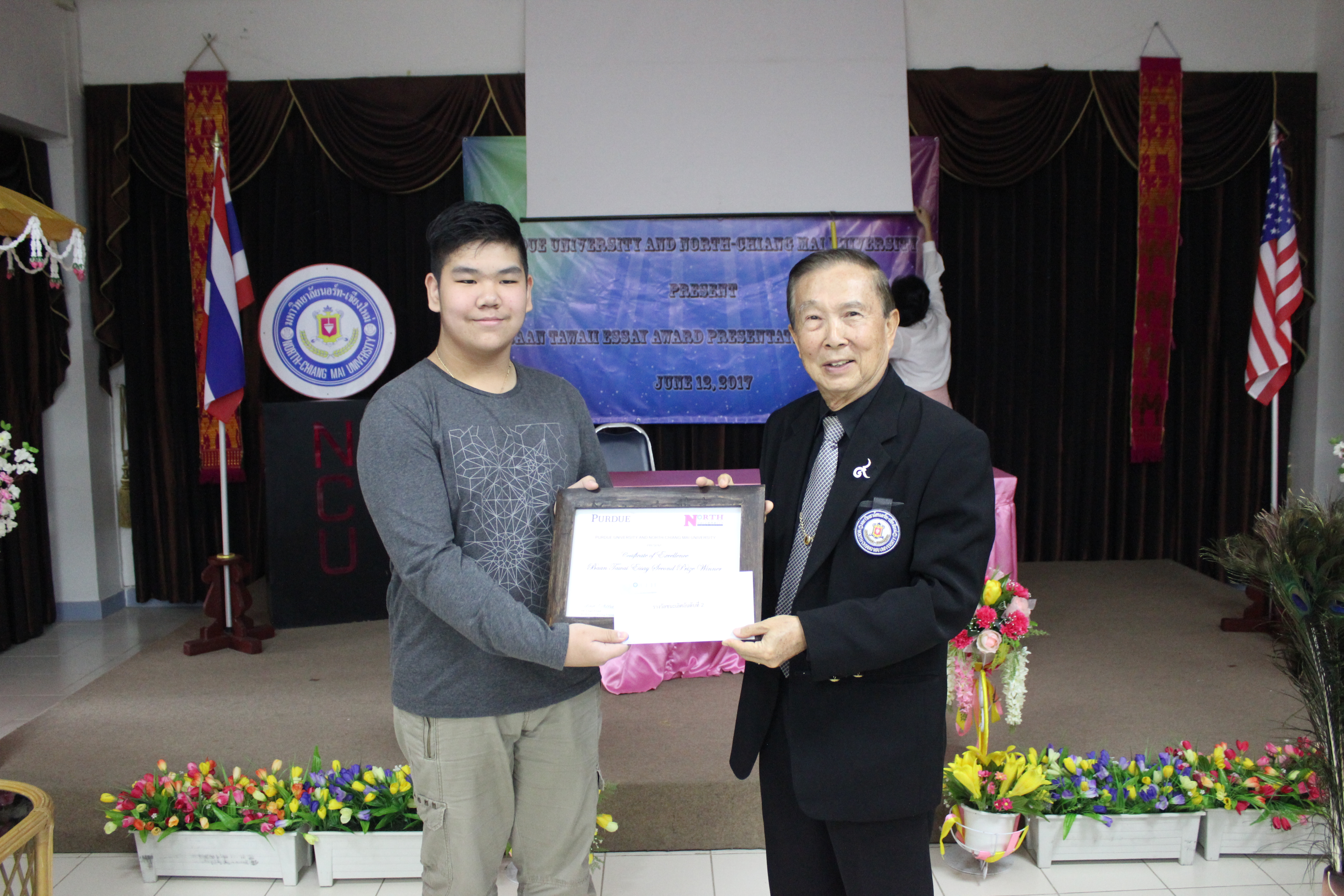 อาจารย์ณรงค์ ชวสินธุ์ อธิการบดีมหาวิทยาลัยนอร์ท-เชียงใหม่ มอบเงินรางวัลรองชนะเลิศอันดับหนึ่ง 3,000 บาท พร้อมประกาศนียบัตร แก่ คุณเกวลิน เชียงธีระ